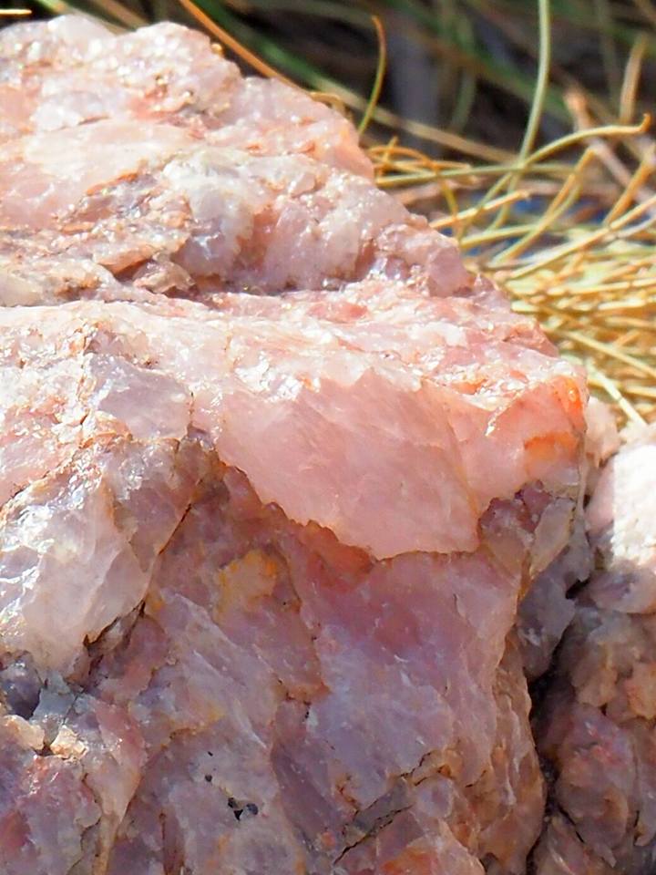 残念ながら、目に見える部分のほとんどは、紫外線で色が抜けてしまっています。ローズクォーツにもいろんなピンクがあるけど、本来のこの山の色は、かなり濃いピンクだったそう。