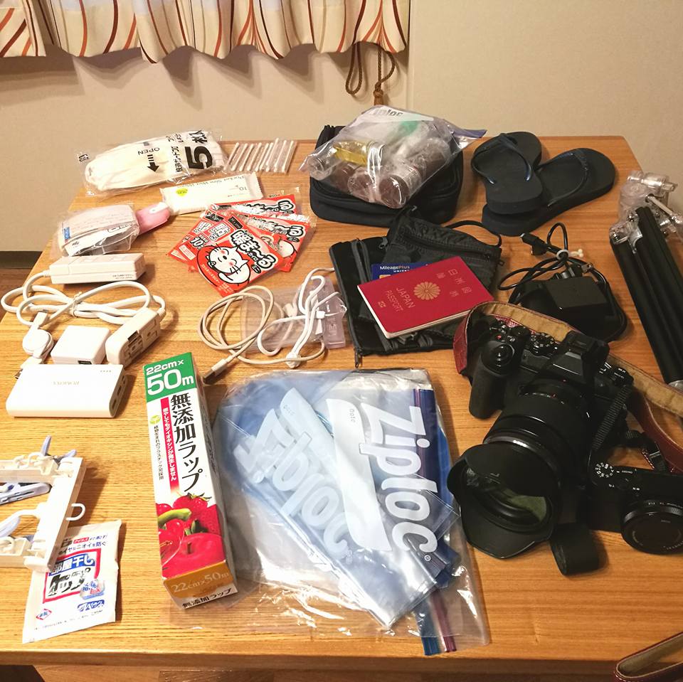 今回は、暖かいところと寒いところ両方行きます。写真の荷物全部、30Lのリュックになんとか詰めました!カメラを入れて全部で約10キロ。