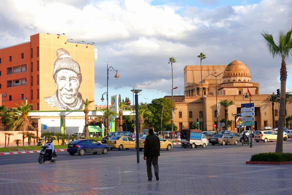 *写真はモロッコのマラケシュ駅をでたところ。この壁一面のおじさんも優しい顔をしている・・・気がする。でも、なんのための壁画なのか、よくわからない。日本でいうアパマンション??